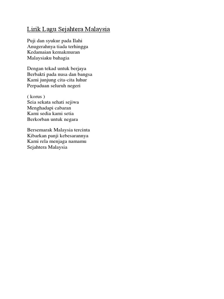 Lirik Lagu Sejahtera Malaysia Puji dan syukur pada Ilahi Anugerahnya tiada terhingga Kedamaian kemakmuran Malaysiaku bahagia Dengan tekad untuk berjaya Berbakti pada nusa dan bangsa Kami junjung cita-cita luhur Perpaduan seluruh negeri KORUS Seia sekata sehati sejiwa Menghadapi cabaran Kami sedia kami setia Berkorban untuk negara. August 21 July 50 June 18 May 5. Enable Notifications OK No thanks Sertai Kami.